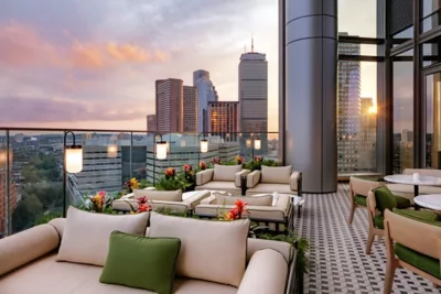 Perched on the 17th floor of Raffles Boston at 40 Trinity Place, Long Bar & Terrace is a rooftop oasis with skyline views that stretch across the South End and Back Bay. It’s elegant but relaxed — polished interiors, plush seating, and an outdoor terrace that feels especially magical during warmer hours.