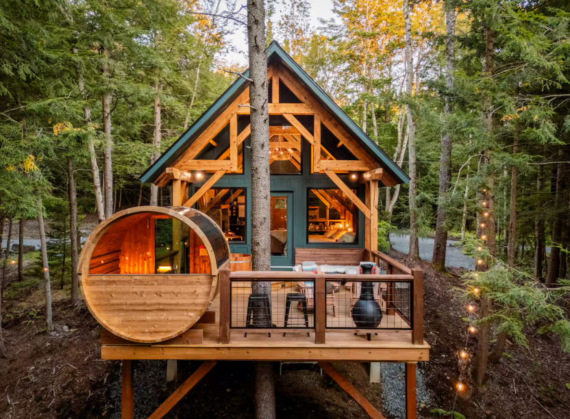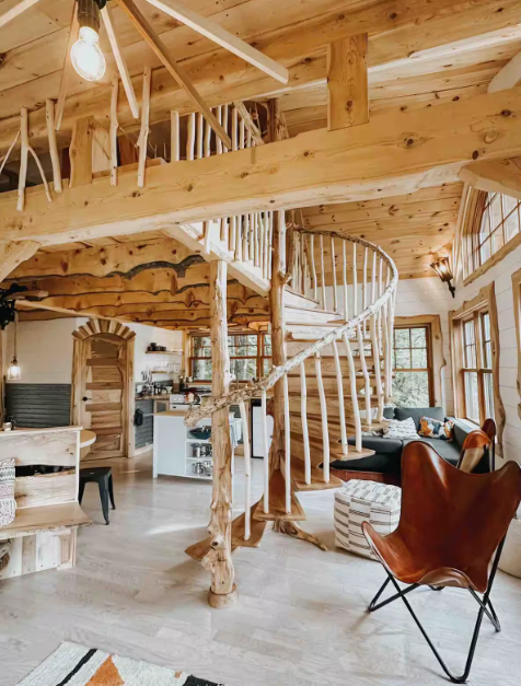 - Description: This whimsical treehouse sits on four acres of private forest, offering a magical escape for nature lovers. Rustic interiors, a cozy loft bedroom, and a wood stove create a warm and inviting atmosphere. Guests can relax on the deck overlooking the woods, enjoy hiking trails just outside the door, or simply disconnect and listen to the sounds of the forest. It’s a perfect choice for a romantic weekend, creative retreat, or simply a break from the ordinary.