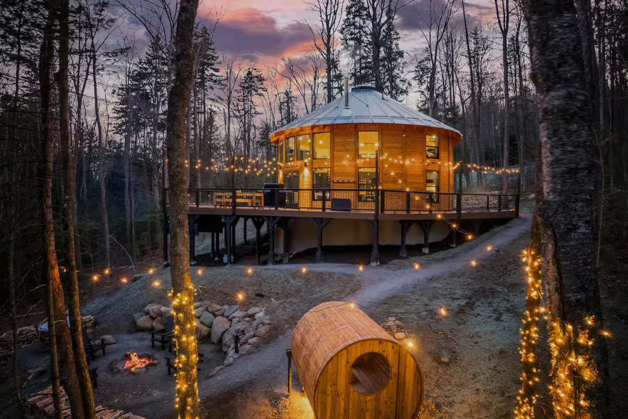 - Description: Combine rustic charm with modern amenities in this spacious yurt surrounded by woodland. Its circular design offers an airy and open feel, while a wood stove provides warmth for winter nights. Outside, a fire pit and seating area invite guests to roast marshmallows or sip cocoa under the stars. Ideal for families, couples, or friends seeking a nature-immersive experience.