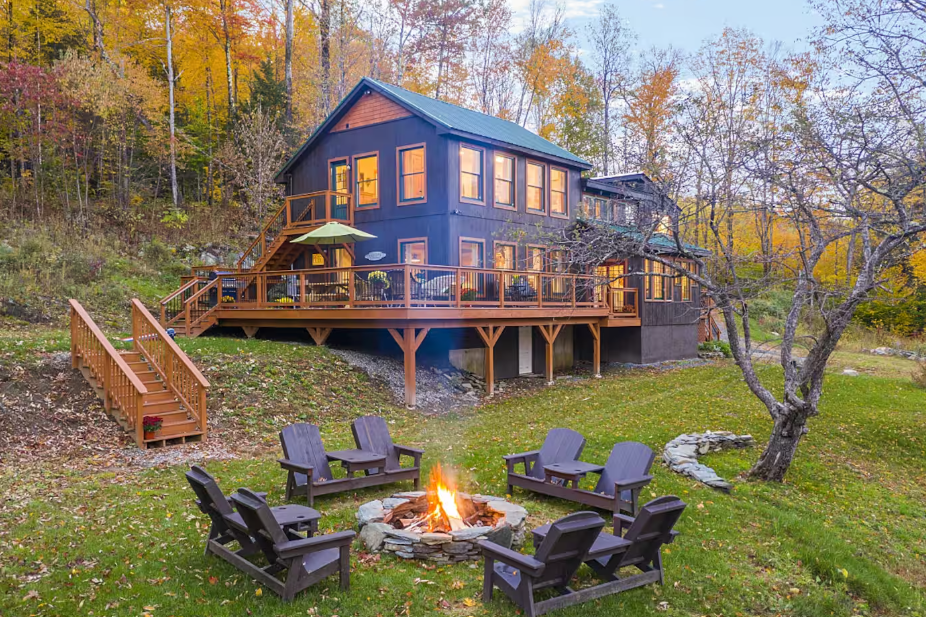 - Description: Perched on a hill with sweeping mountain views, this large chalet blends rustic charm with upscale amenities. A stone fireplace, high-beam ceilings, and spacious living areas make it perfect for groups or families. The expansive deck and outdoor fire pit are ideal for stargazing or enjoying breakfast with a view. Close to hiking trails, ski areas, and local eateries, this lodge offers a luxurious base for exploring Western Massachusetts.